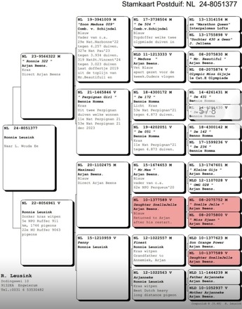 Fils de la 5e NPO Ruffec 911 km, 1746 pigeons 22e NU Ruffec 9063 pigeons. Discipline: Grand Fond N° Matricule: NL24-8051377 Pays: Pays bas Type: Pigeon Sexe: Mâle Année naissance: 13 jan. 2024